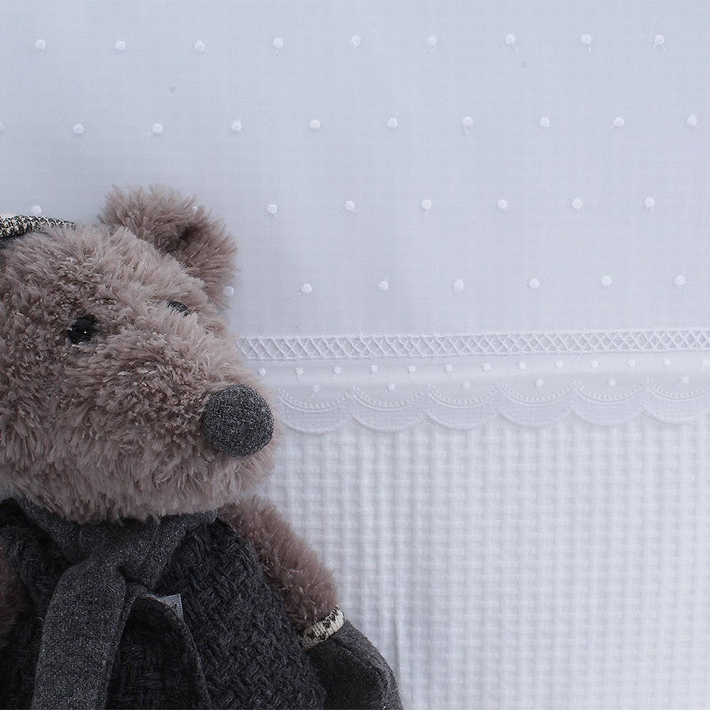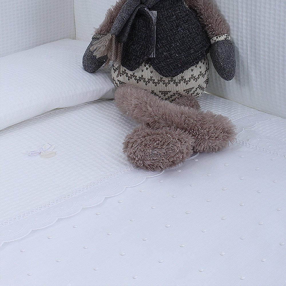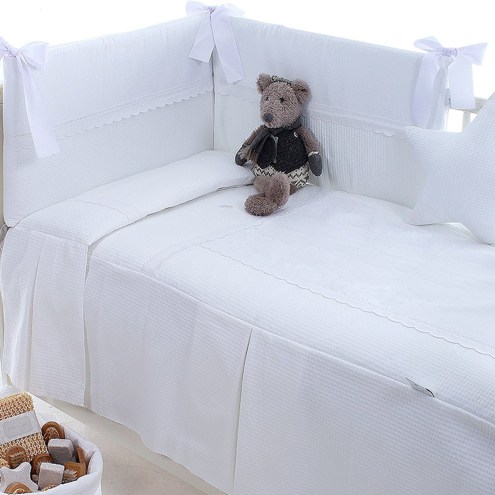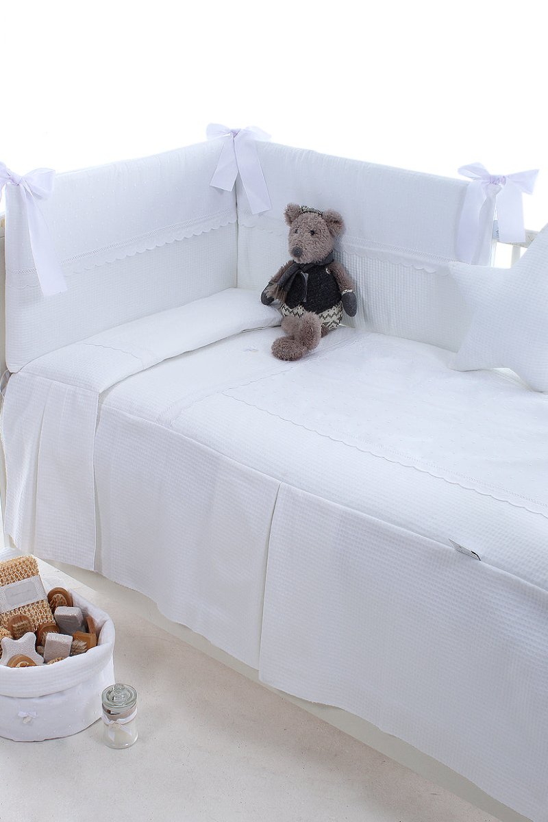 Colcha con protector de cuna de estilo clásico y tejidos lenceros. Piqué, plumeti y puntillas. A elegir en color blanco o beige.