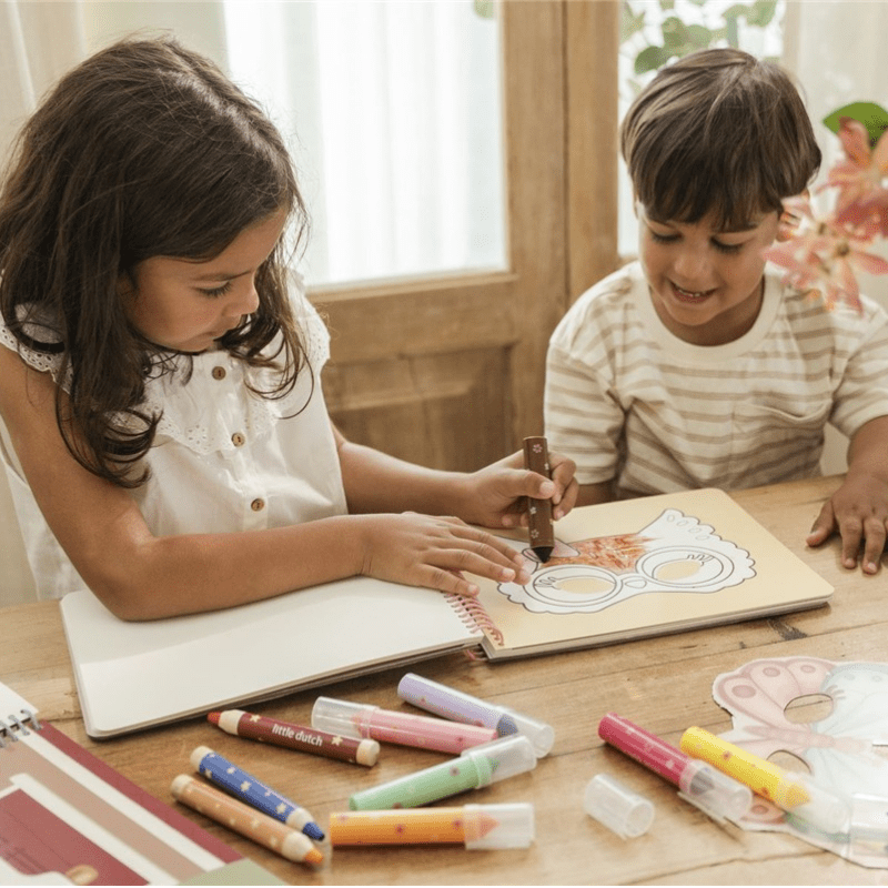 Libro creativo con 20 hojas de máscaras para pintar y recortar. Incluye tijeras y pegatinas para que los niños disfruten decorando y personalizando sus propias máscaras. Perfecto para estimular la imaginación y la creatividad mientras se divierten.