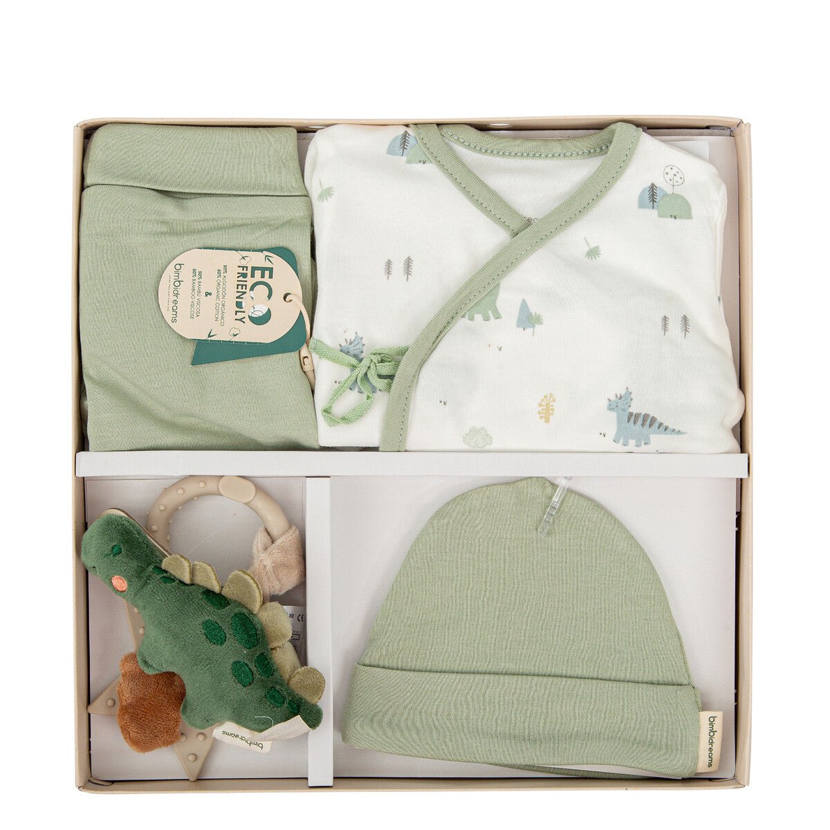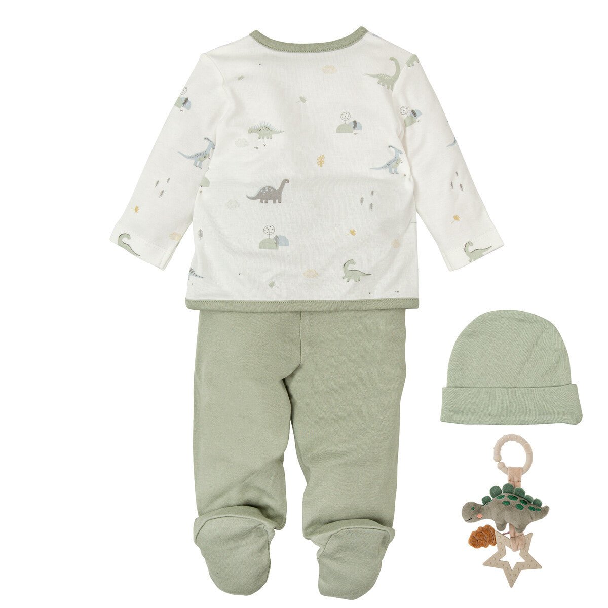 Precioso Pack de primera puesta de algodón 100% orgánico. Jubón + polaina + gorrito + sonajero mordedor.